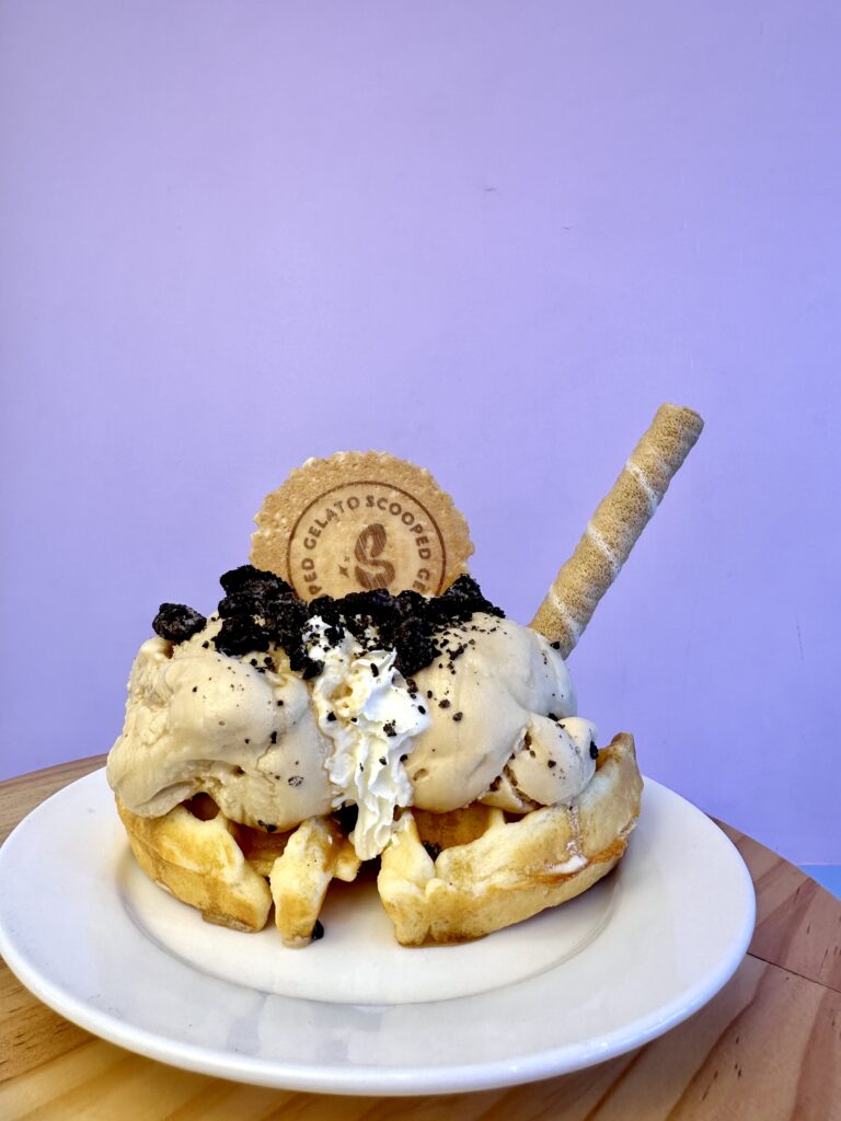 A warm waffle, freshly made in-store topped with whipped cream, maple syrup and your choice of 2 scoops of gelato and 2 toppings